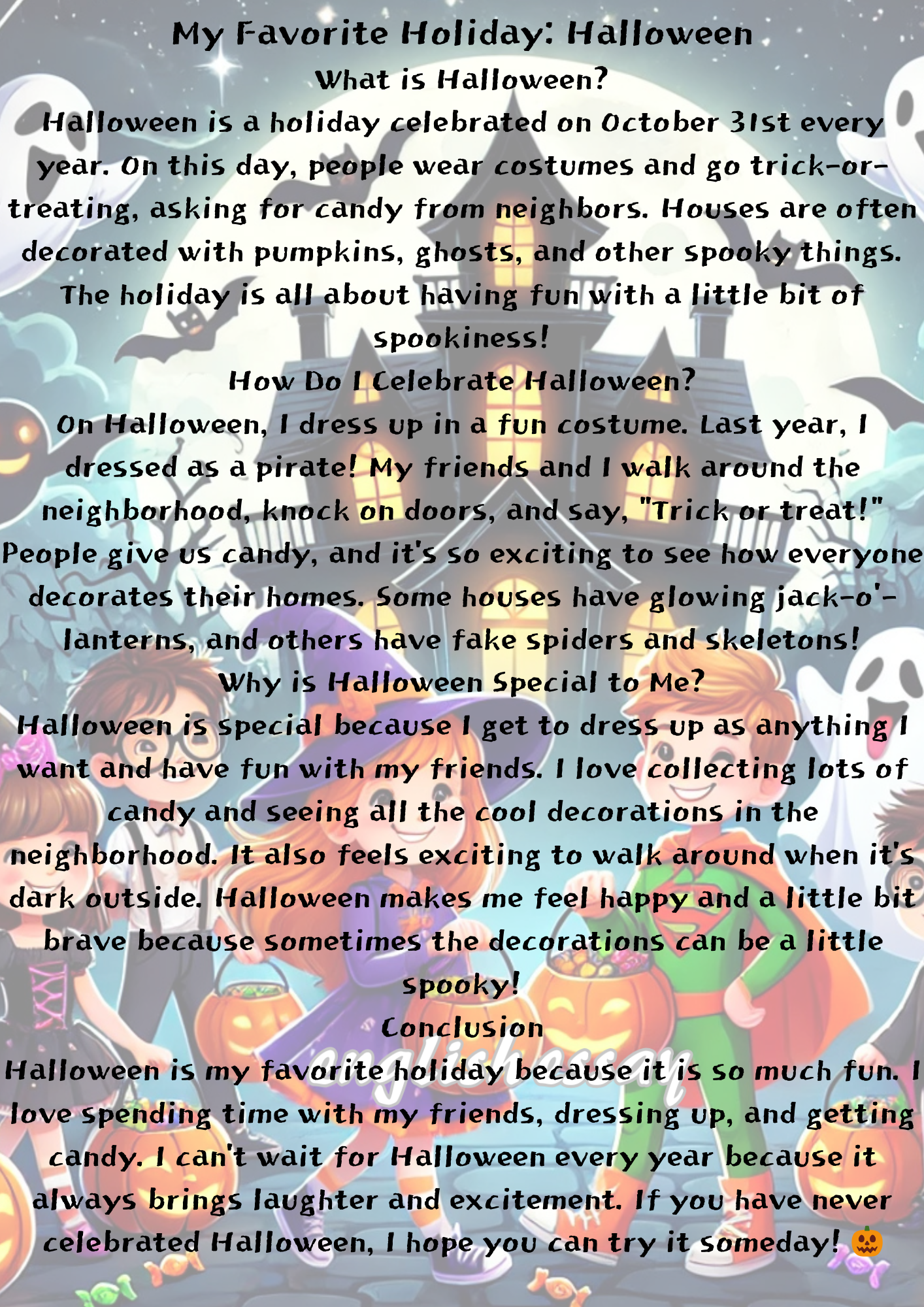 When writing about your favorite holiday, you can talk about what the holiday is, how you celebrate it, and why it’s special to you. This essay will describe what makes the holiday meaningful and fun!